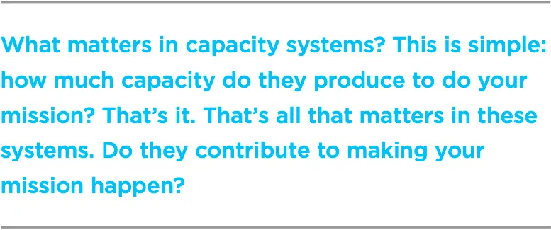 Remember what Einstein said: “Not everything that is measured matters and not everything that can be measured, matters.” Don’t measure everything about a system, measure what matters. What matters in capacity systems? This is simple: how much capacity do they produce to do your mission? That’s it. That’s all that matters in these systems. Do they contribute to making your mission happen? As such, capacity assessment is a mission-critical system within all organizations.